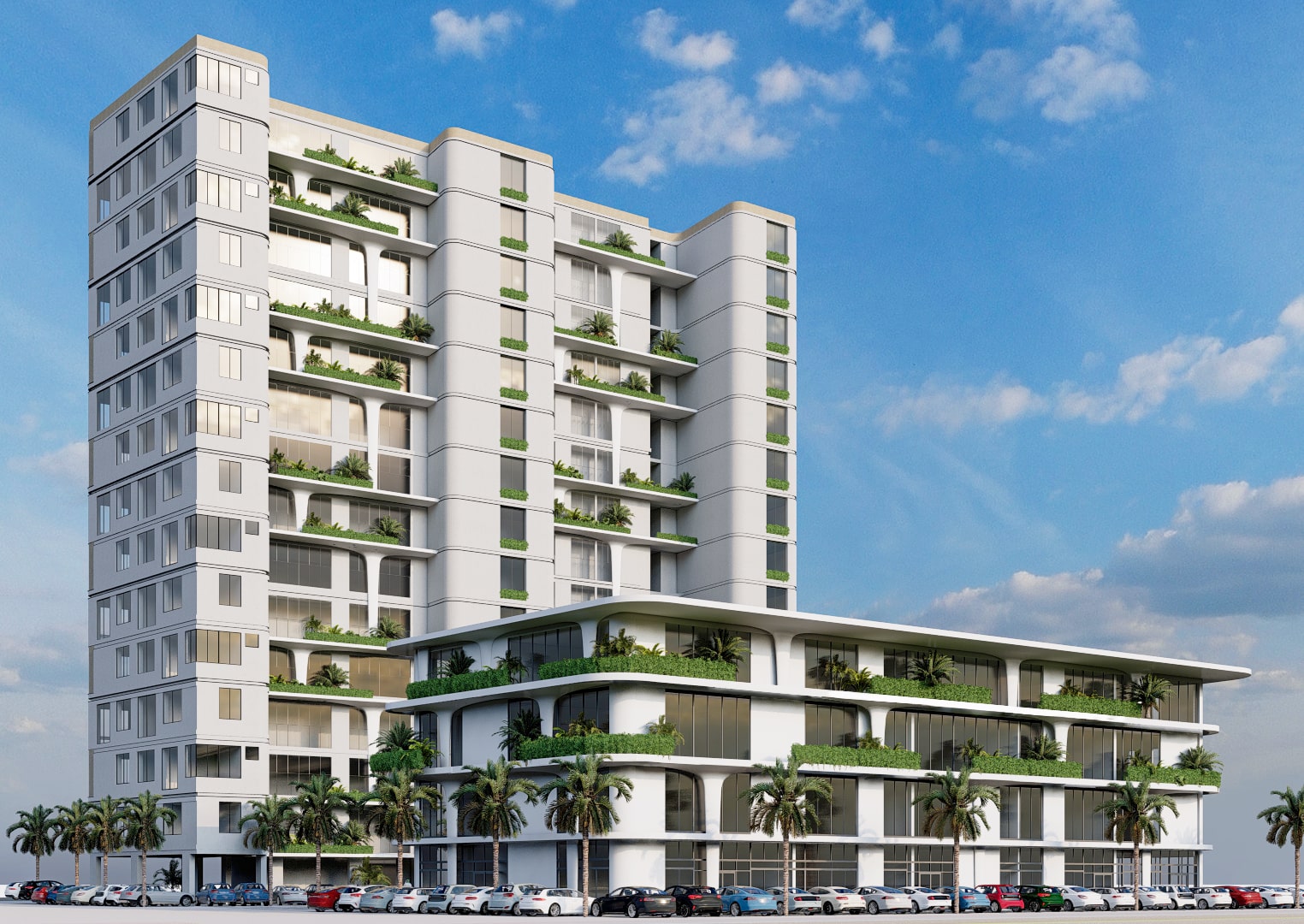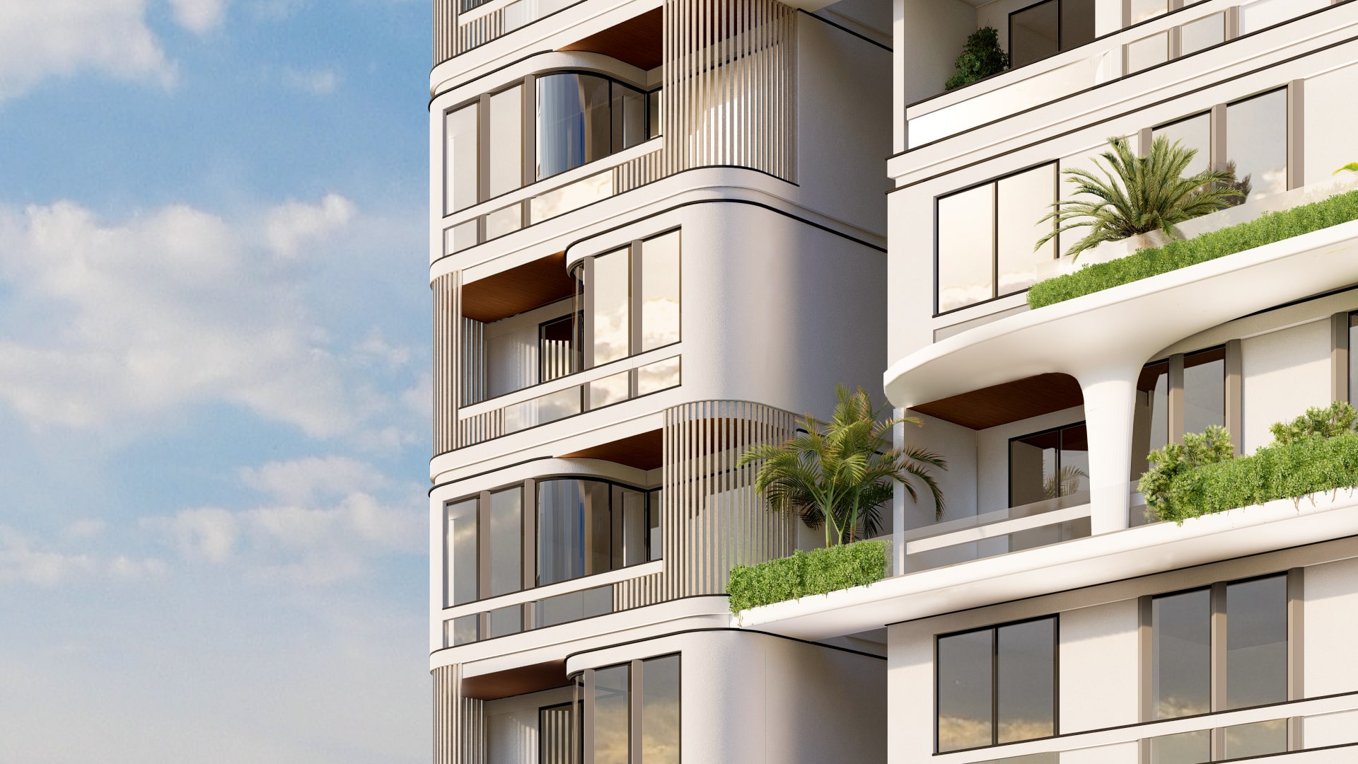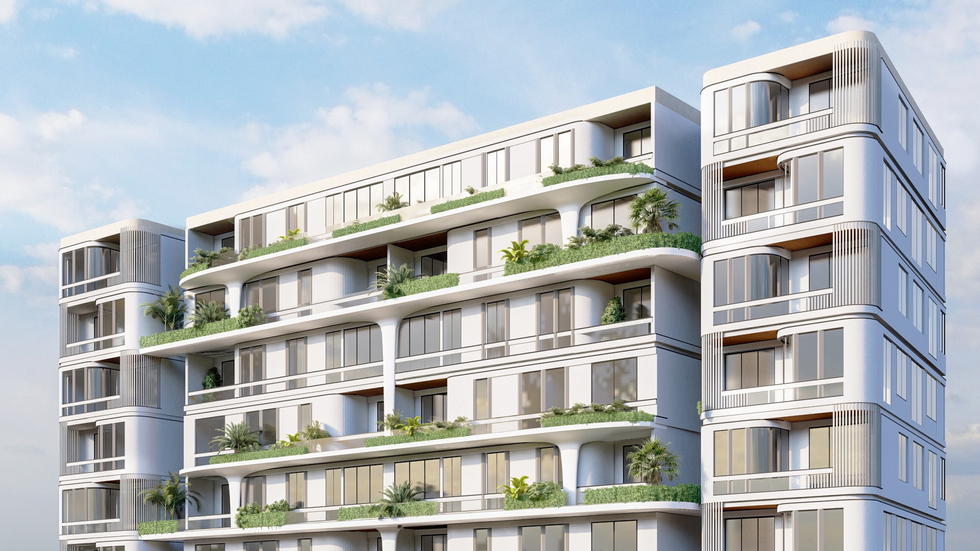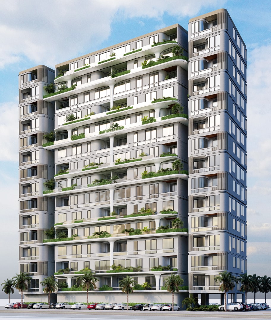 This modern residential building blends clean lines with soft organic forms to create a refined urban living experience. Designed with a strong indoor-outdoor connection, the structure features generous terraces with built-in greenery, allowing nature to become part of everyday life. Curved corner elements and vertical louvers add elegance and rhythm to the facade, while warm lighting highlights the architectural layers. The result is a contemporary, nature-integrated design that feels both vibrant and serene.