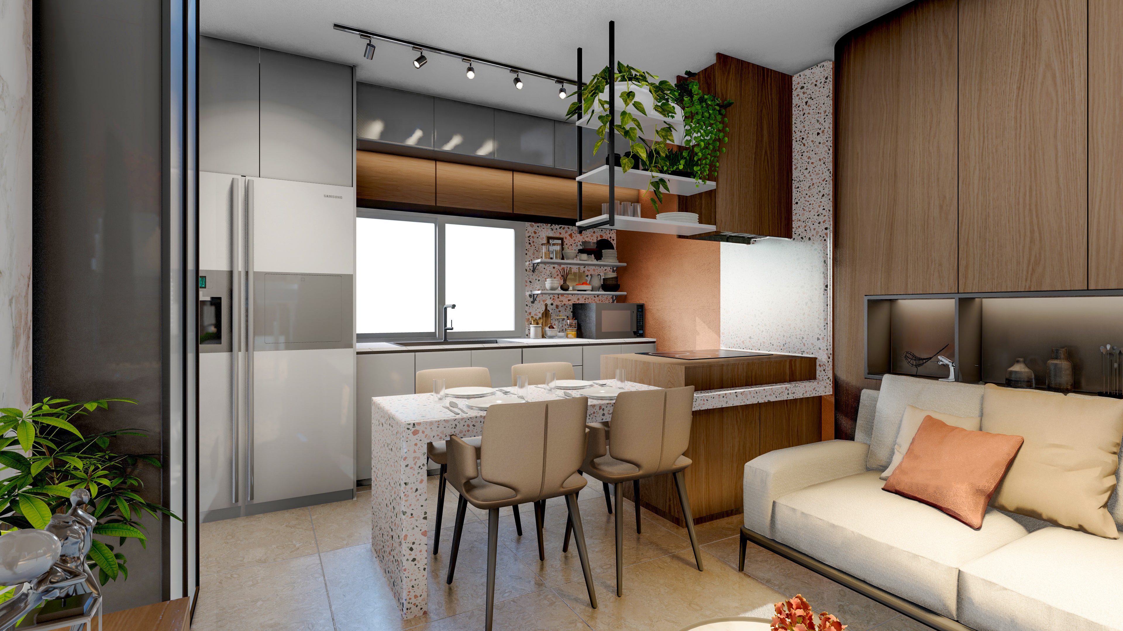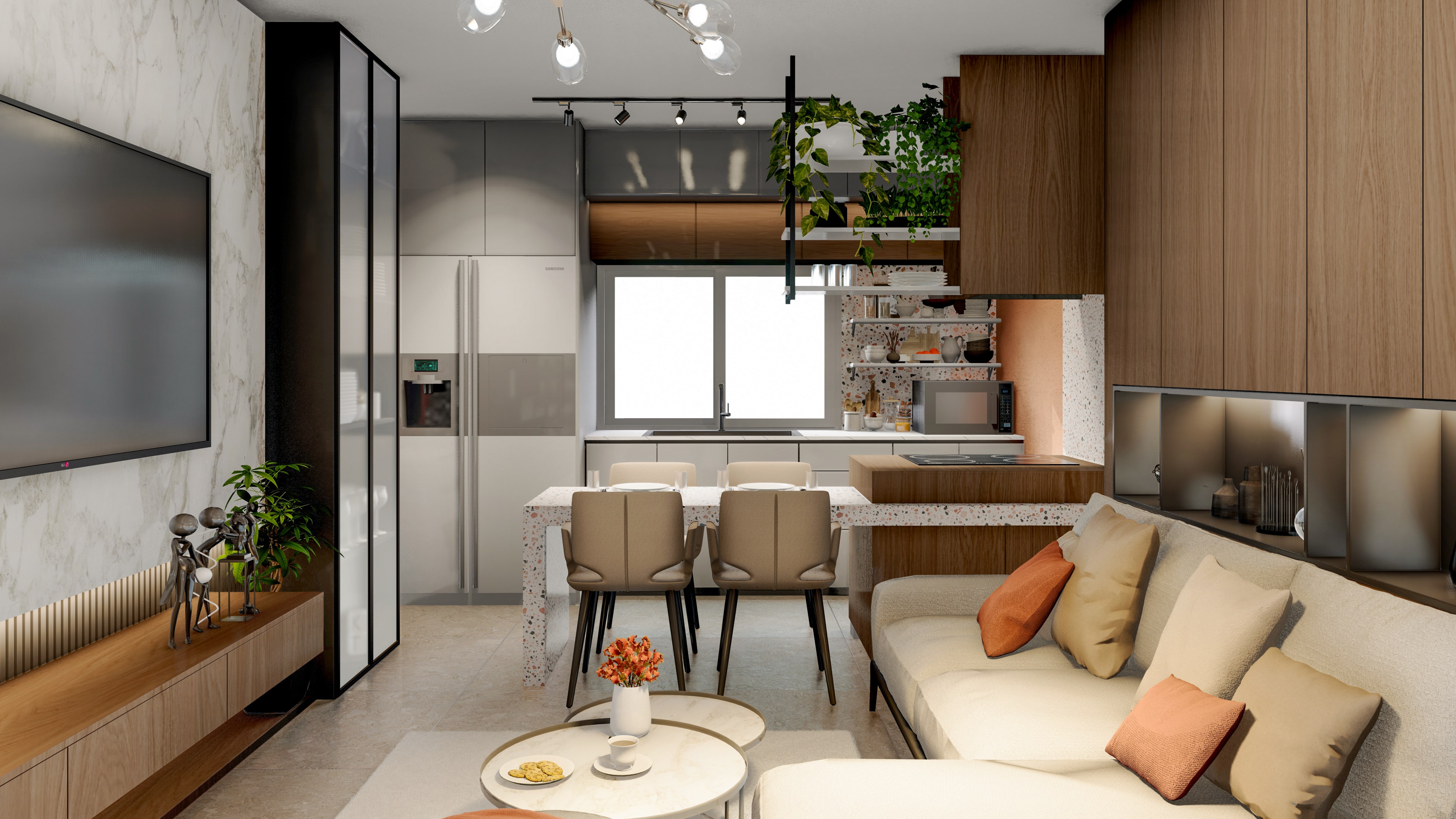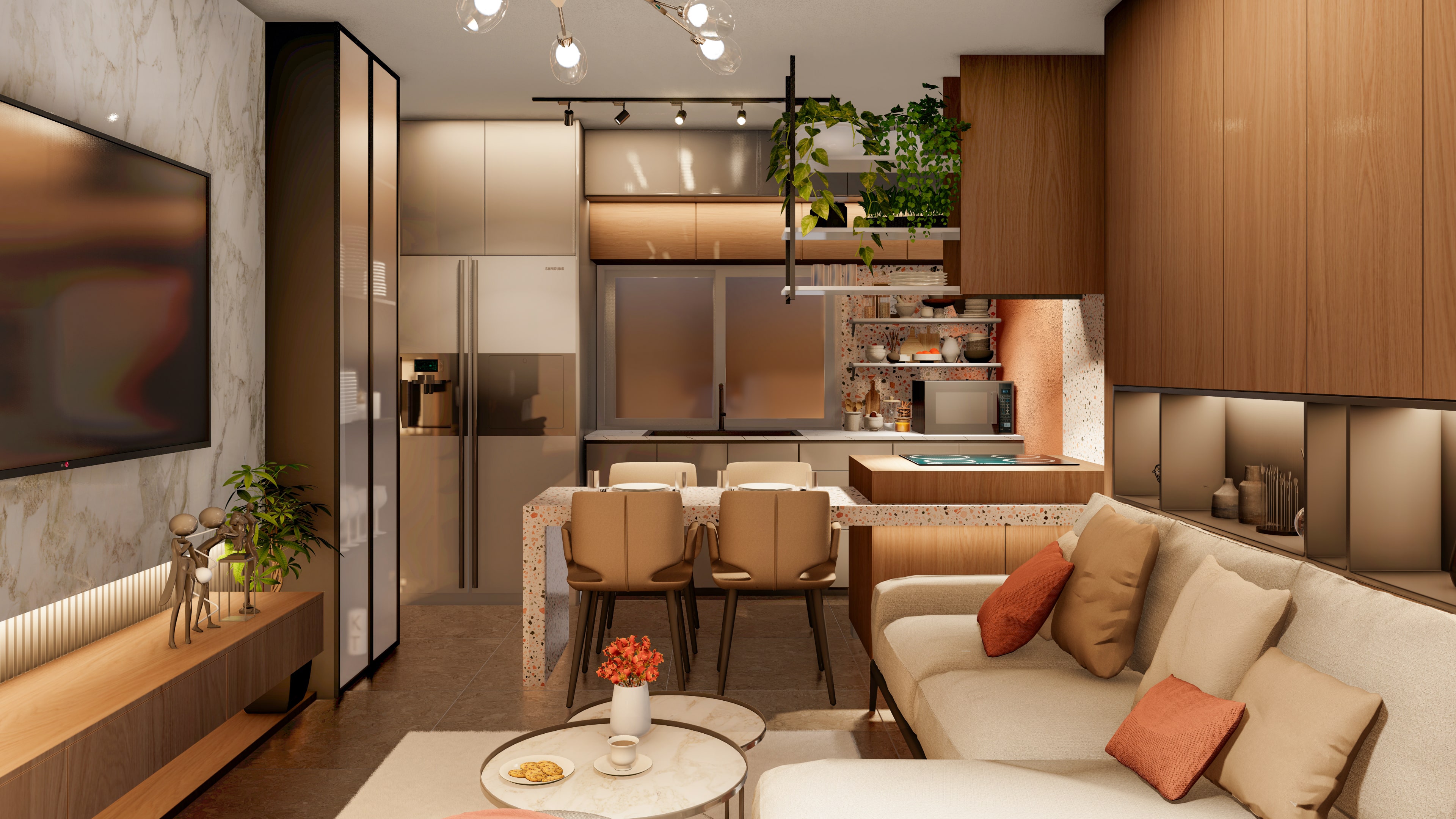Natural materials like wood and terrazzo bring texture and playfulness, while warm tones, cozy fabrics, and greenery infuse the space with a welcoming, lived-in atmosphere. Smart spatial planning and custom built-ins ensure every corner is maximized without compromising aesthetics. The result is a compact yet dynamic home that reflects the personality of its owner—youthful, grounded, and full of life.